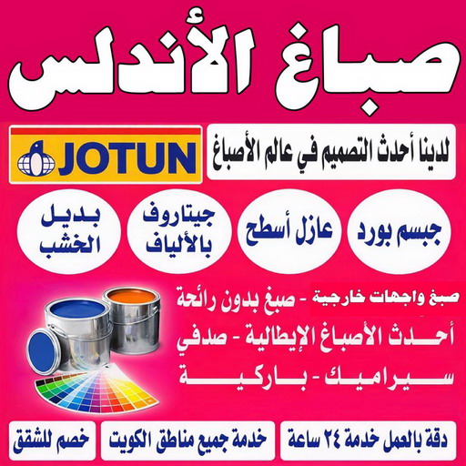 صباغ رخيص بالاندلس ، لدينا جميع انواع الاصباغ واحدث موديلات من ورق جدران ، نقوم بتركيب ورق الجدران بدقة وسرعة وحرفية لدينا أيضا رسم حائط  طوفة ولوحة جدارية ، نوفر لكم صبغ مطفي – صبغ إيطالي – ترخيم – تعتيق ، وغيرها من الموضات  نقوم بصبغ السقف والطوف والحيطان بألوان راقية وزاهية حسب الذوق والطلب تناسب جميع الأذواق ، ورق جدران موضة جديدة بأشكال وموديلات متعددة ومختلفة ) ، نعمل على دقة التنفيذ  ورضا الزبون ونضمن لكم الجودة الصبغ والتركيب ، نقوم بالعمل في إطار منطقة الاندلس وجميع مناطق محافظة  الفروانية .